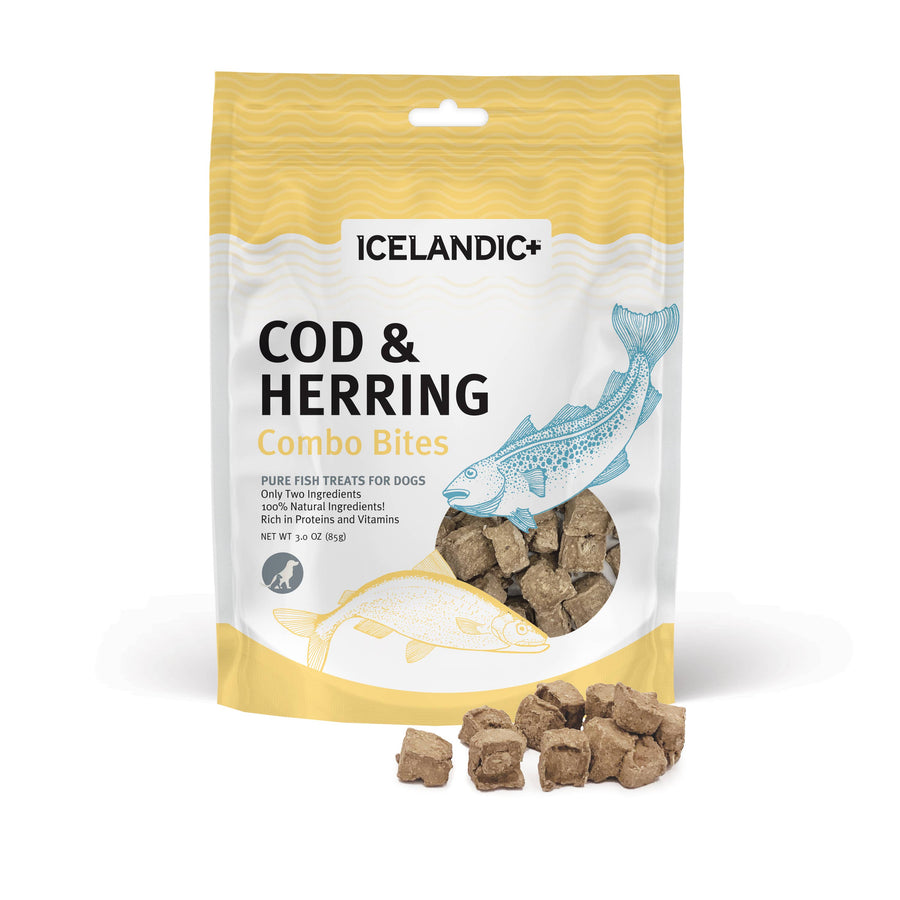 100% Pure Icelandic+ Cod & Herring Combo Bites Dog Treat Your dog will love the irresistible taste and satisfying crunch of our nutritious and natural Cod Herring Combo Bites Fish dog treats, made from just two ingredients Cod and Herring!