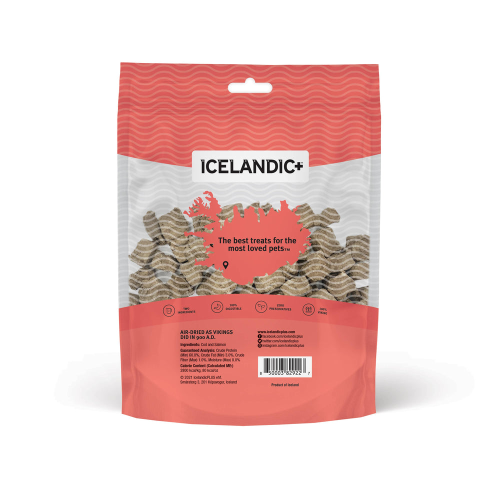 100% Pure Icelandic+ Cod & Salmon Combo Bites Dog Treats Your dog will love the irresistible taste and satisfying crunch of our nutritious and natural Cod & Salmon Combo Bites Fish dog treats, made from just two ingredients, Cod and Salmon! They are caught fresh daily in the cold, pure waters of Iceland, and air-dried within FDA, USDA, EU, and MAST standards.