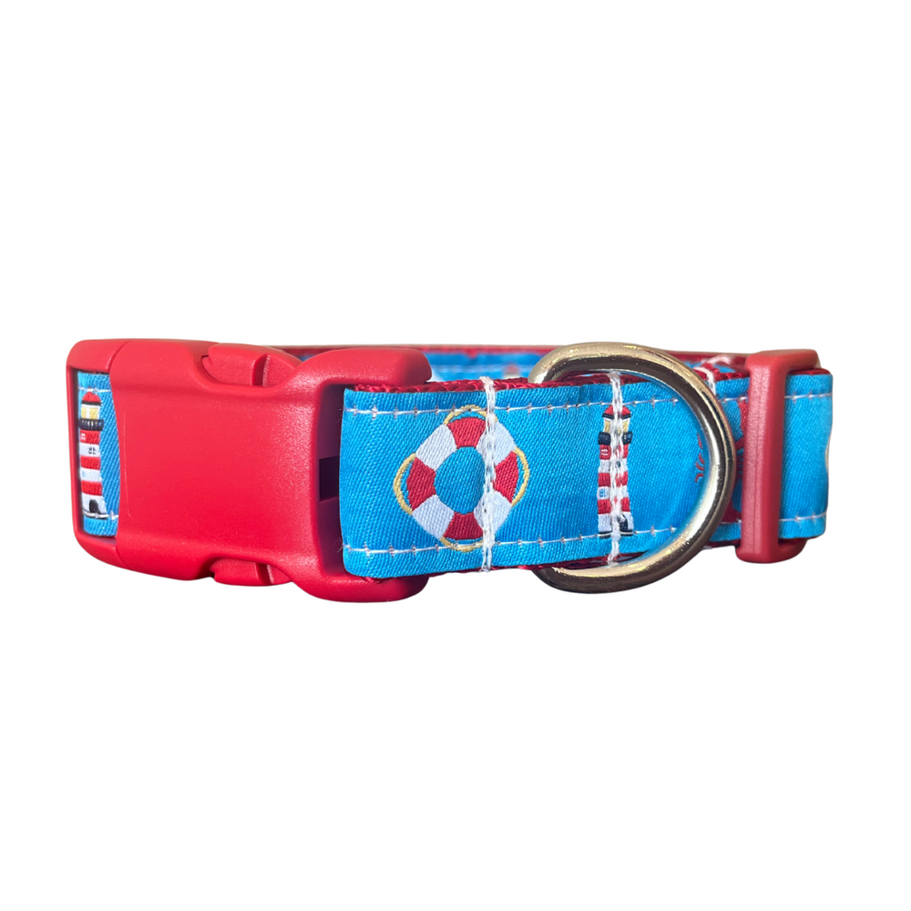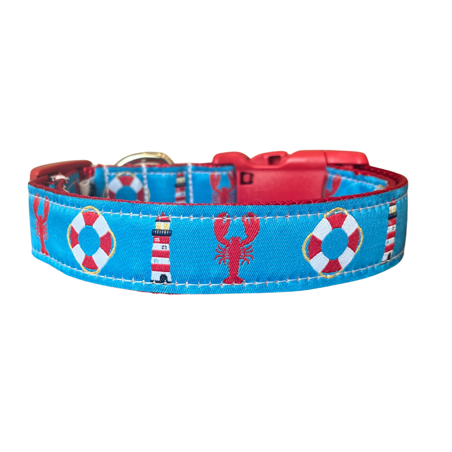 Pattern: Lobsters, lighthouses, and buoys on a blue background and red webbing.