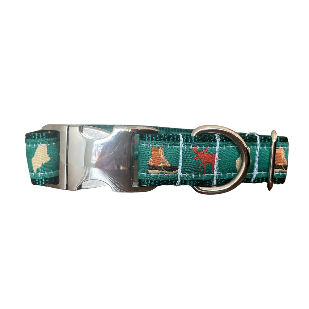 Pattern: Moose, state of Maine outline, and bean boot on a green background