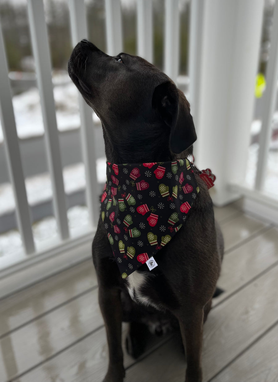 Pattern: Green, dark purple, and red mittens with snowflakes on a black background.