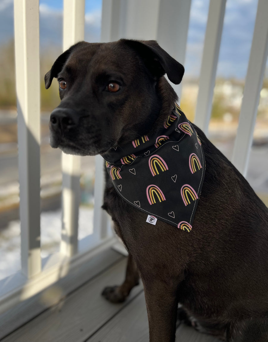 Pattern: Pink, orange, and yellow rainbows with hearts on a dark brown background.