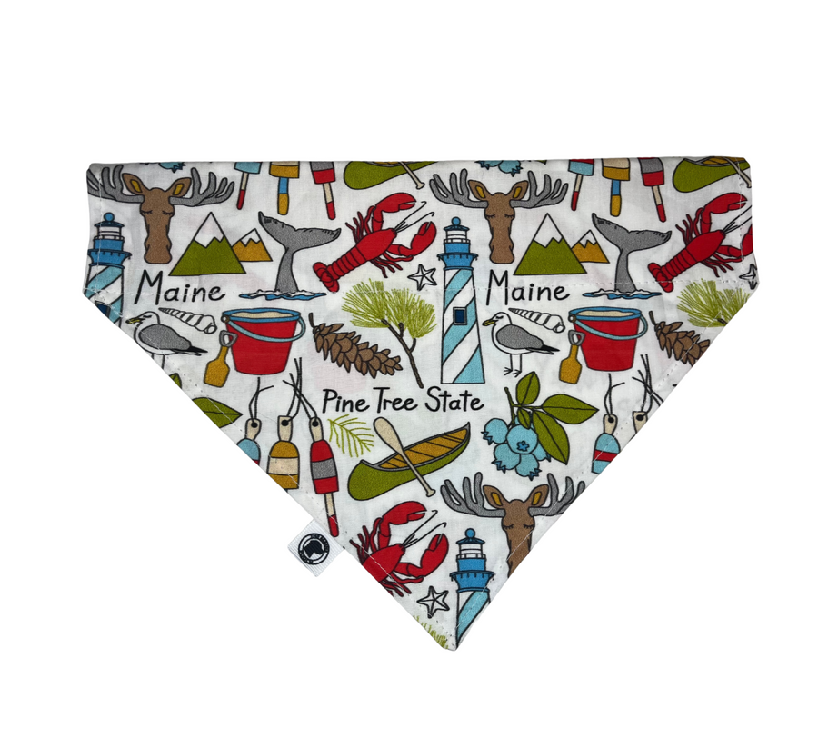 Pattern: Pine cones, lighthouses, canoes, seagulls, buoys, lobsters, mountains, whale tails, moose, blueberries, bucket with shovel, "Maine" and "Pine Tree State".