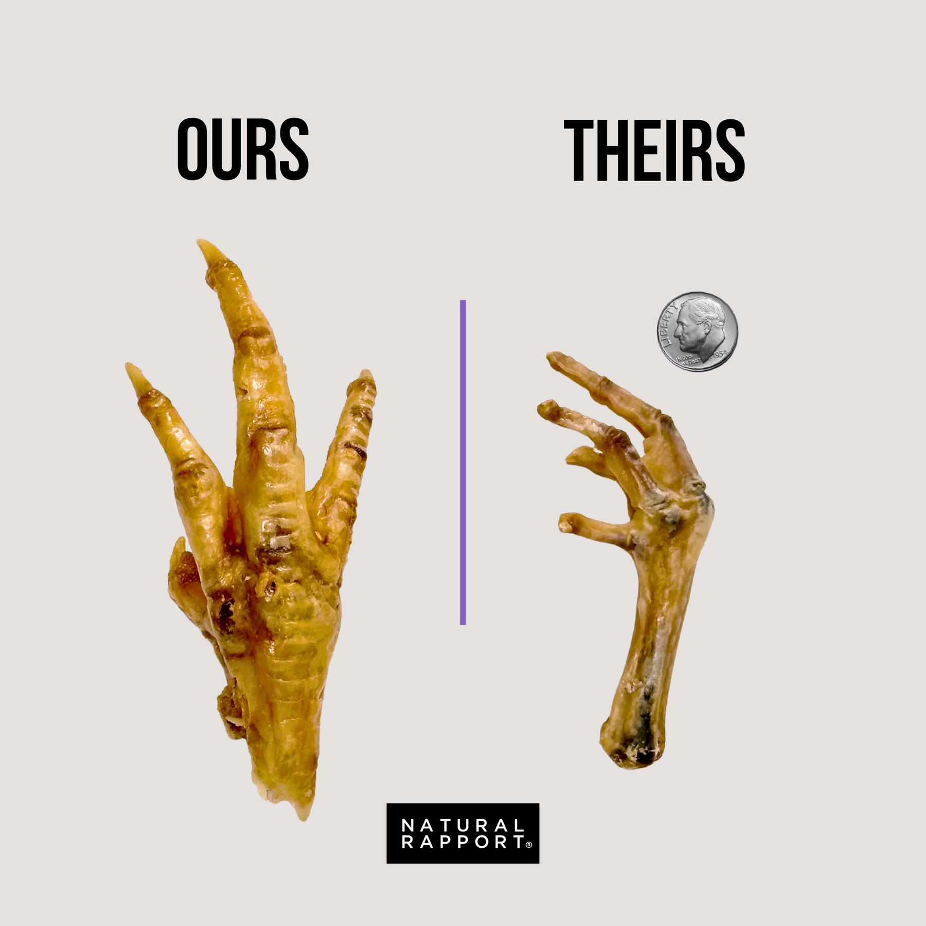 It’s NO SMALL FEAT. We present to you BIG feet. We source our Grade AA, jumbo chicken feet right here in the USA, making them a healthy, delicious chew for your pup that are over twice the size of the competition.