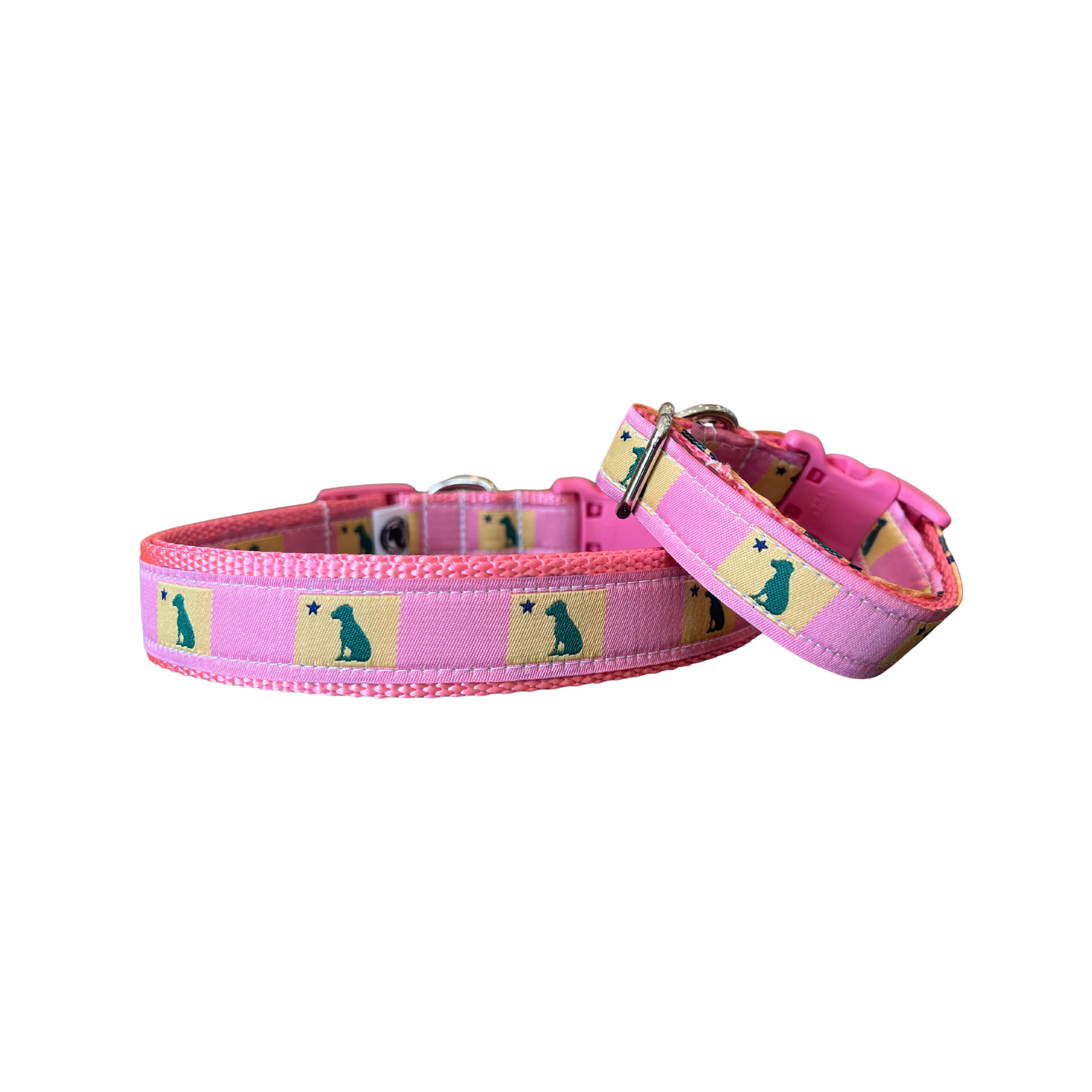 **Please note that the 3/4 inch/plastic hardware option of this collar comes with a pink plastic buckle, but has a metal triglide. Please see last photo.**